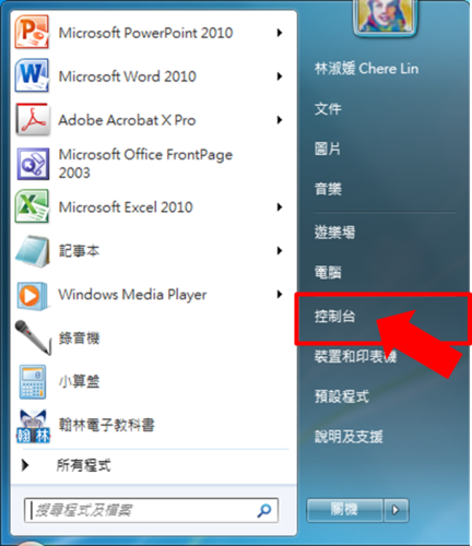一、麥克風設定: 請點選電腦左下開始,出現選單,點選「控制台」: