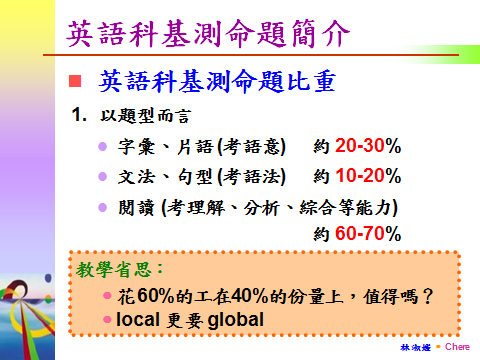 舉一個簡單的例子:某國家城市的地鐵圖,英語版,修改得比較簡易,符合國中生能力來看,問學生如果有100元一日票(one-day pass),要怎麼規劃參訪路線?各位如果去國外自助旅行,要搭地鐵,看路線圖時,自己在腦海裡規劃時是用什麼語言來想?是不是自己最擅長使用的母語來思考呢?這就是為何我們建議可以用中文寫路線規劃。要先讀懂資料、擷取所需的訊息,這是測驗英語閱讀能力。「會規劃路線」是測驗思考能力。至於要用英語寫的人,即使文法有錯,在不至於無法理解的情形下,規劃合理適當就給分。我還是要強調: